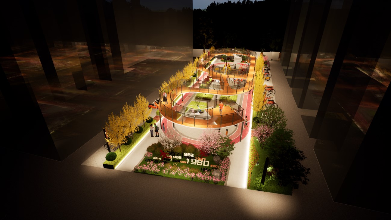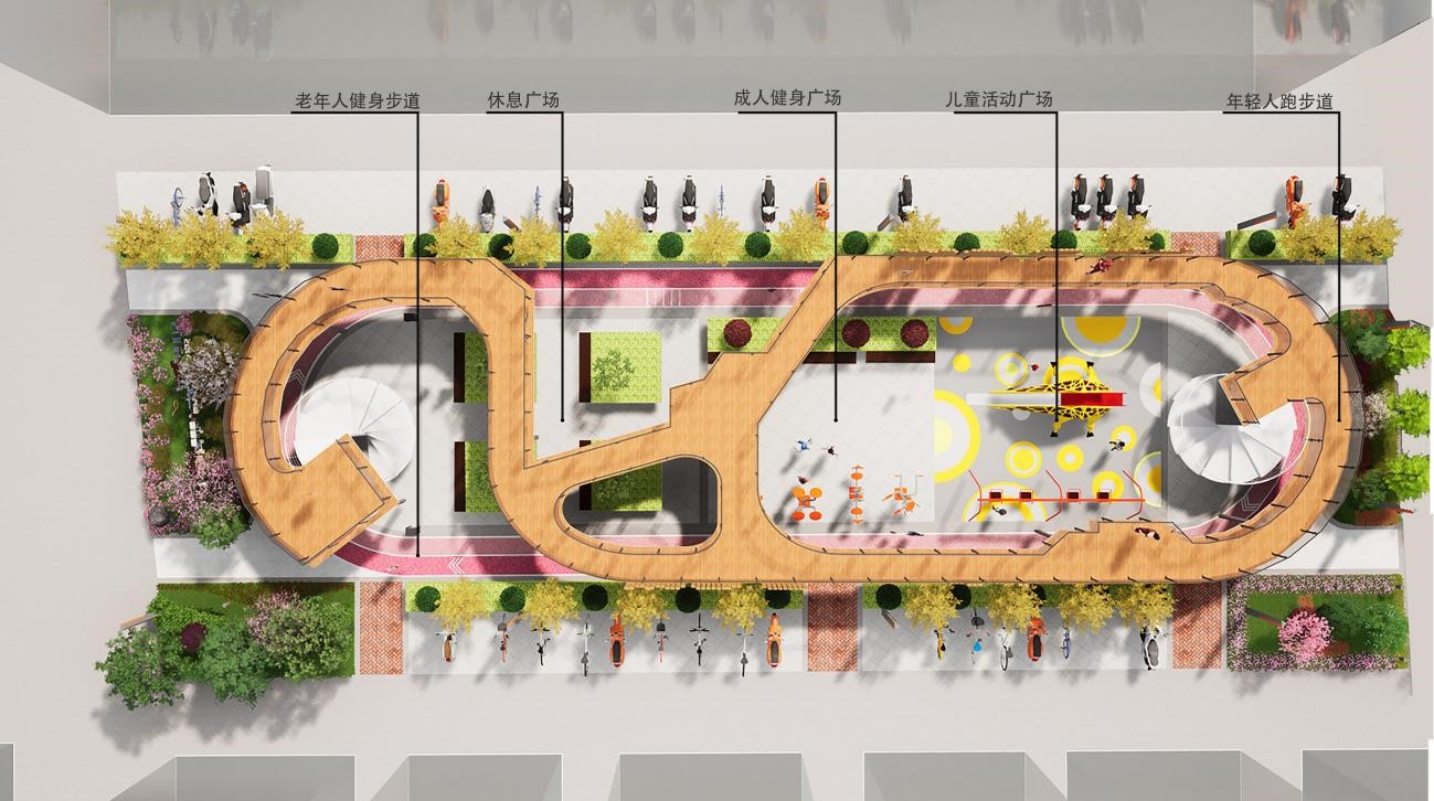 该作品以新乡市第十中学家属院为基址,通过立体化健身场所的设计,将老旧小区消极空间改造为空间集约、富有创意、活力焕发的积极空间以促进居民之间的健身和交流,满足了全龄、全民健身的需求,深受小区居民的欢迎。