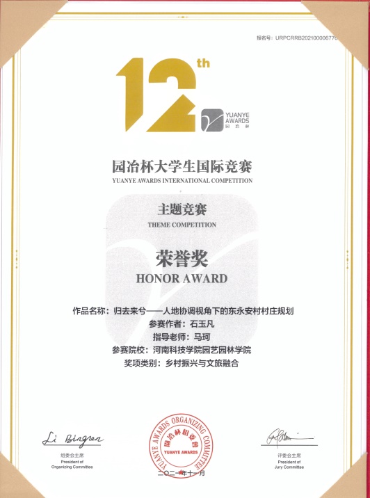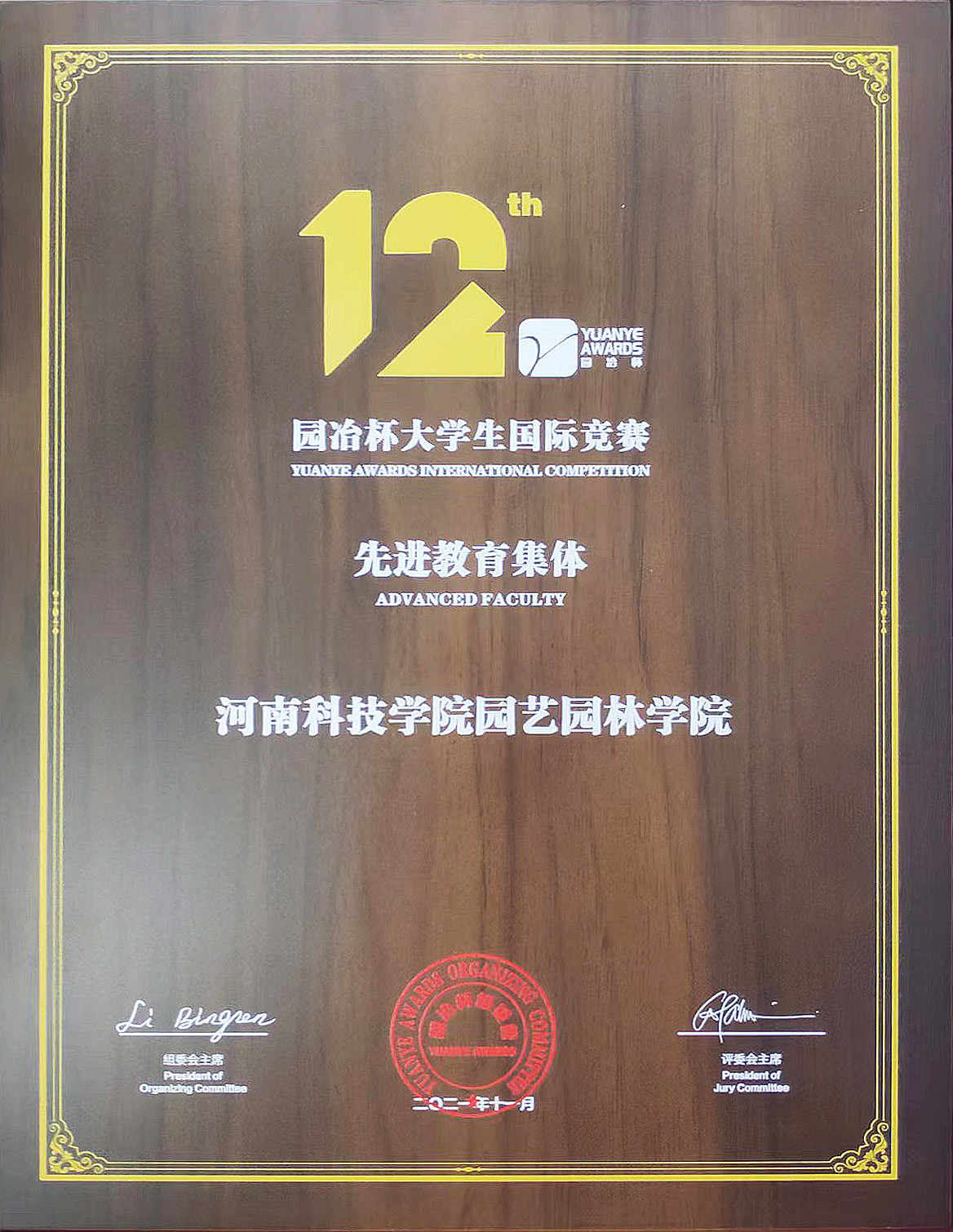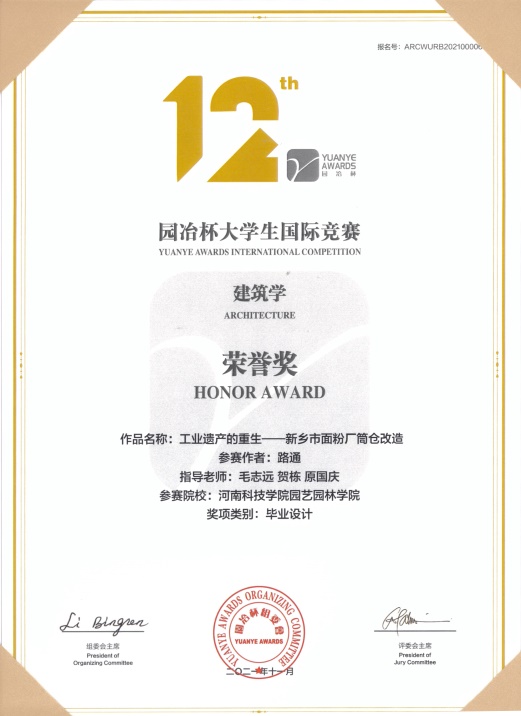 近日,由园冶杯国际竞赛组委会、中国风景园林网主办,国际风景园林师联合会亚太区(IFLA-APR)、亚洲园林协会共同协办的第十二届“园冶杯”国际竞赛公布获奖作品名单并颁奖。我院教师毛志远、贺栋、原国庆指导的城乡规划专业路通同学作品“工业遗产的重生——新乡市面粉厂筒仓改造”获荣誉奖;马珂老师指导的城乡规划专业石玉凡同学作品“归去来兮——人地协调视角下的东永安村庄规划”获荣誉奖;河南科技学院园艺园林学院被组委会授予先进教育集体。