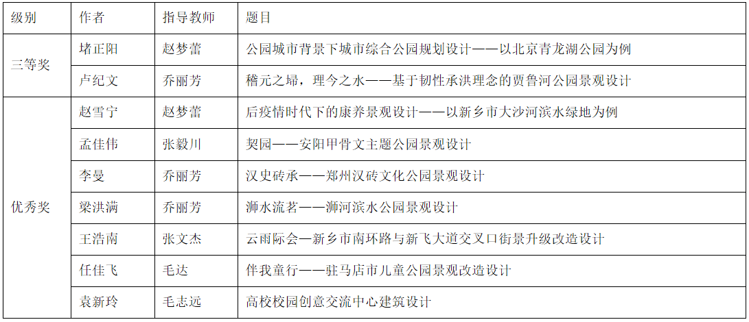 我校推荐的毕业设计作品共获奖9项,其中:堵正阳同学的“公园城市背景下城市综合公园规划设计——以北京青龙湖公园为例”(赵梦蕾讲师指导)、卢纪文同学的“稽元之埽,理今之水——基于韧性承洪理念的贾鲁河公园景观设计”(乔丽芳副教授指导)获得三等奖,另有7项作品获得优秀奖。此次竞赛,7所院校每个学校各推荐20项优秀设计作品参赛,最终评出获奖作品38项。我院获奖数量是总体平均水平的1.67倍,展示了风景园林专业学生积极向上、奋发进取的精神风采。今后我院将进一步加强专业教育,培养竞赛意识和氛围,力争取得更好成绩。