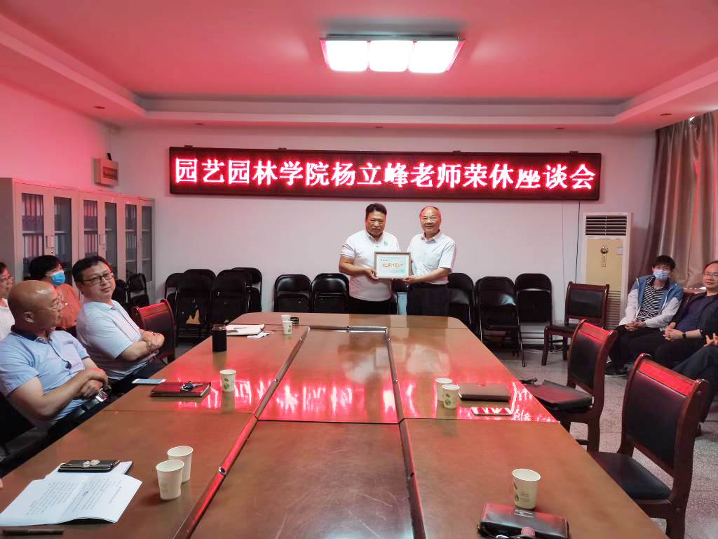 院党委书记郜庆炉为杨立峰老师颁发荣休证书和纪念品,园林植物学教研室主任尤扬回顾了杨立峰老师39年从教历程,参会教师分享了杨老师执教、共事的点滴生活,感谢杨老师多年的培养和关怀;杨立峰老师发表荣休感言,对自己39年的工作历程进行了简要回顾,对学校和学院的关心和祝福表示感谢。