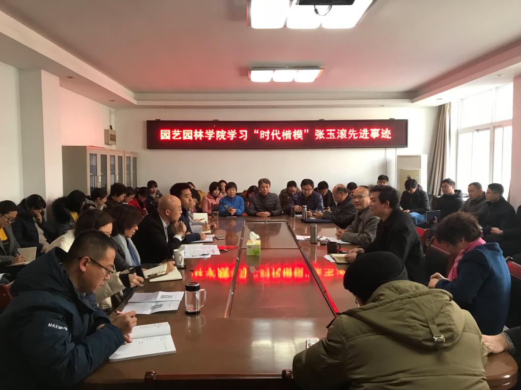 12月21日,园艺园林学院在实验楼B段316会议室集体学习‘时代楷模’张玉滚先进事迹,学院党政班子及全体教工共60余人参加了会议。