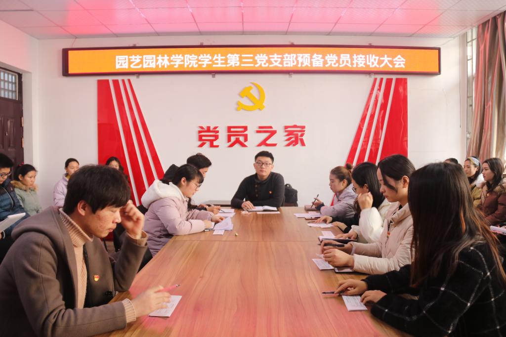 2018年12月26日中午,园艺园林学院分别在实验楼B106、B316会议室召开了园艺园林学院学生第一、二、三党支部预备党员接收大会。学院团委辅导员老师以及学生党支部全体党员参加大会。