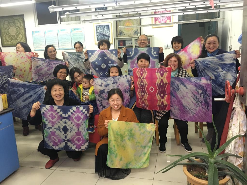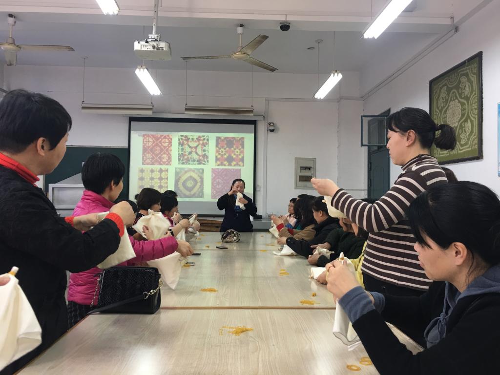 活动伊始,扎染工作室郭海燕老师向大家介绍了扎染工艺的起源和应用,向大家示范了扎染的常用技巧与手法。然后女教工们开始自己动手体验扎染,她们仔细的在绢布上绑扎和设计,大家互相交流、互帮互助,经过一番努力,老师们都完成了自己的作品。看着一幅幅构思巧妙图案别致的成品,大家兴奋不已,纷纷围观点评,连连称赞!