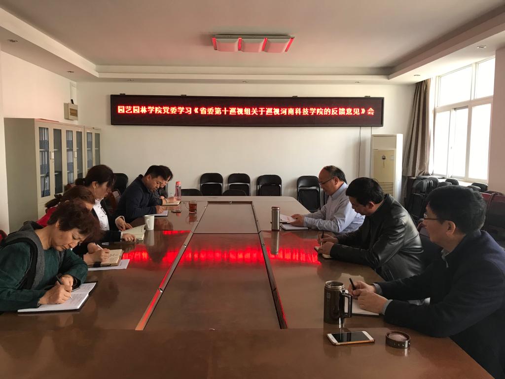 3月19日下午,园艺园林学院党委在实验楼B316会议室组织学习了《省委第十一巡视组关于巡视河南科技学院的反馈意见》,学院党政领导、党委委员参加了会议。会议由学院党委书记郜庆炉主持。