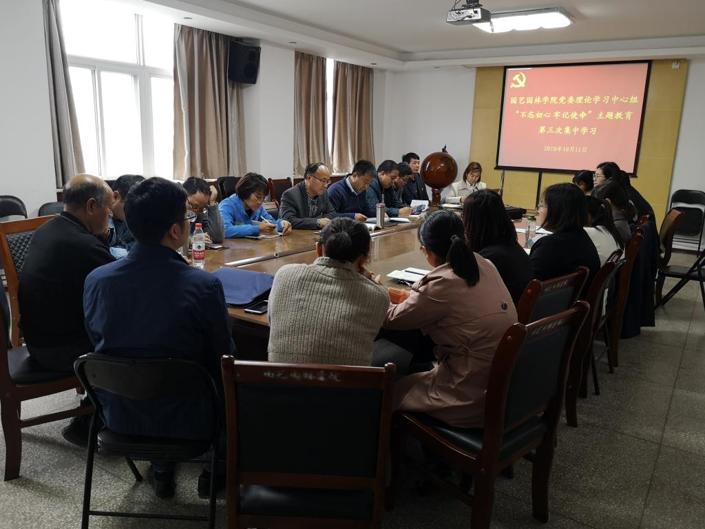 10月11日下午,园艺园林学院党委理论学习中心组在实验楼B316会议室召开“不忘初心、牢记使命”主题教育第三次集中学习研讨会议。园艺园林学院党委理论学习中心组全体成员、教工党支部书记、教工党员代表参加学习。