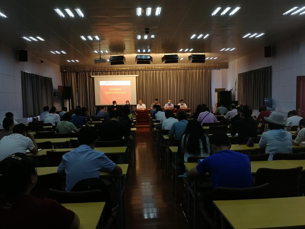 党委书记郜庆炉首先介绍了新入职的博士汪显友、张淮霞和刘苗苗;院长周俊国从政治学习、党建、师资队伍建设等9个方面回顾了学院上半年的工作,并对下半年学院工作做了统筹部署;党委副书记朱黎娅传达了学校关于新学期疫情防控下学生管理工作的要求及工作安排;副院长齐安国对学院教学基地和实验室建设进行了总结和工作安排;副院长张毅川对学院研究生教育和科研情况进行了总结;副院长沈军对新学期本科教学工作进行了详细安排;最后郜书记强调了学院新冠疫情防控工作的重要性,要求全体教职工以高度的政治责任感加强学习,做好党建工作、文明创建、作风和学风建设等工作。