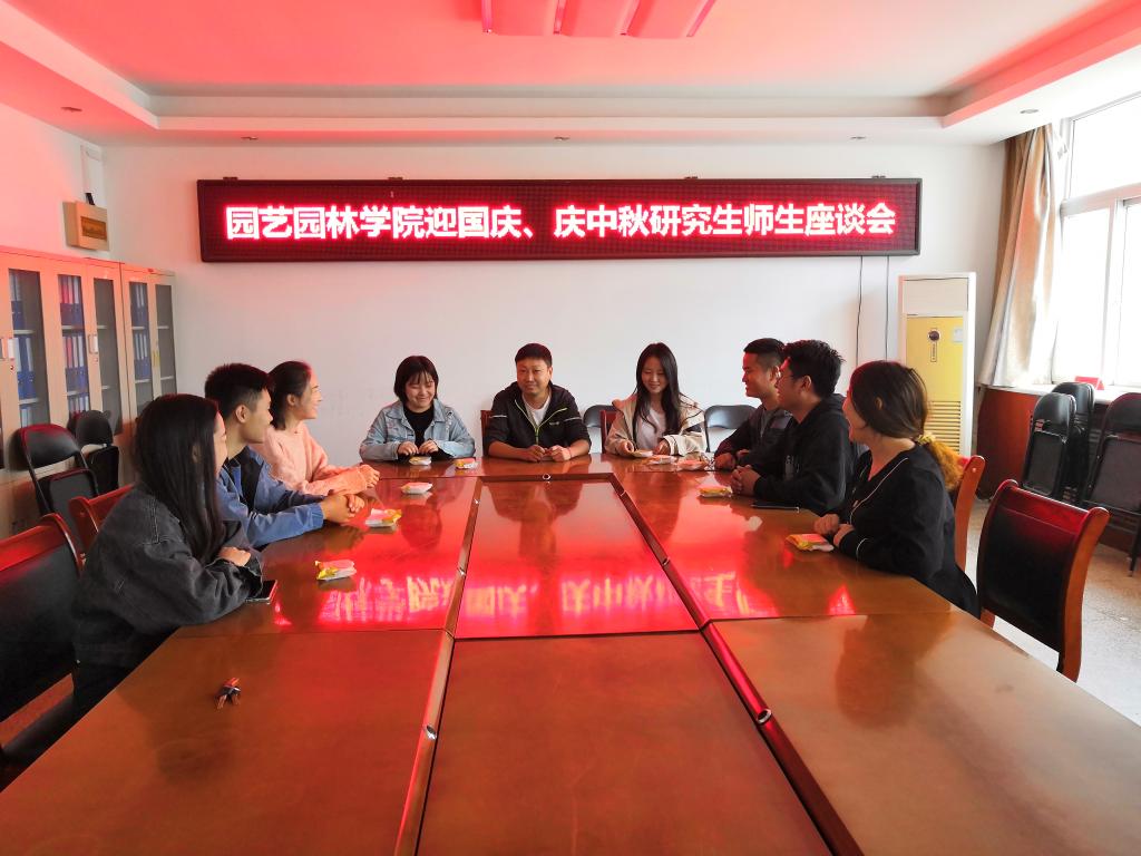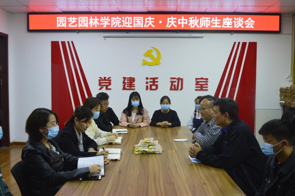 喜迎国庆,月满中秋。在国庆、中秋双节到来之际,为表达对全院师生关怀之情,9月30日,园艺园林学院分别于实验楼B106、B316会议室召开迎国庆·庆中秋师生座谈会。党委副书记朱黎娅主持,党委书记郜庆炉、院长周俊国、学院辅导员、学生代表参加座谈。