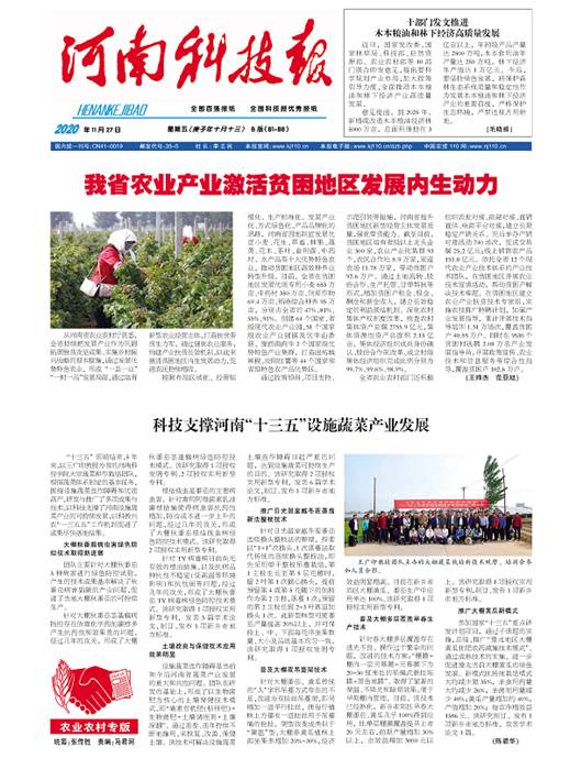 11月25日,河南科技报、河南日报农村版今日头条分别报道了我院王广印教授团队“十三五”科技创新工作成果。河南省大宗蔬菜产业技术体系(以下简称蔬菜体系)创新团队以蔬菜产业为主线,以共性技术研发为平台,以综合试验为载体,开展蔬菜产业相关试验、示范、推广及培训等工作,着力突破蔬菜产业重大技术和共性技术问题。农村脱贫和乡村振兴离不开产业发展,产业发展离不开科技支撑。"十三五"即将结束,五年来,以王广印教授为首的河南科技学院大宗蔬菜耕作栽培团队,根据蔬菜体系制定的基本任务,围绕消除设施蔬菜连作障碍和保持设施蔬菜优质高产等中心任务,研发与推广了多项成果与技术,以科技支撑了河南设施蔬菜产业的可持续发展。同时,团队以科教兴农"一三五五"工作机制为依托,使研发的技术成果尽快"落地结果"。