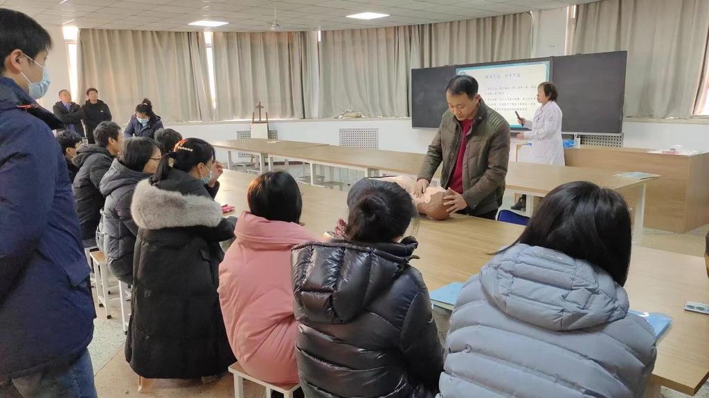 医护人员介绍了急救的基本知识,强调了掌握急救技能对于保障生命安全的重要性。随后,现场演示了单人徒手心肺复苏等操作方法。在互动环节,教师们积极提问,积极参与实操,医护人员耐心指导,现场氛围热烈。