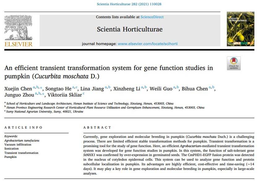 近日,Scientia Horticulturae(农林科学二区)在线发表了我院南瓜科研团队成员陈学进老师的论文“An efficient transient transformation system for gene function studies in pumpkin (Cucurbita moschataD.)”,院长周俊国教授为论文的通讯作者。