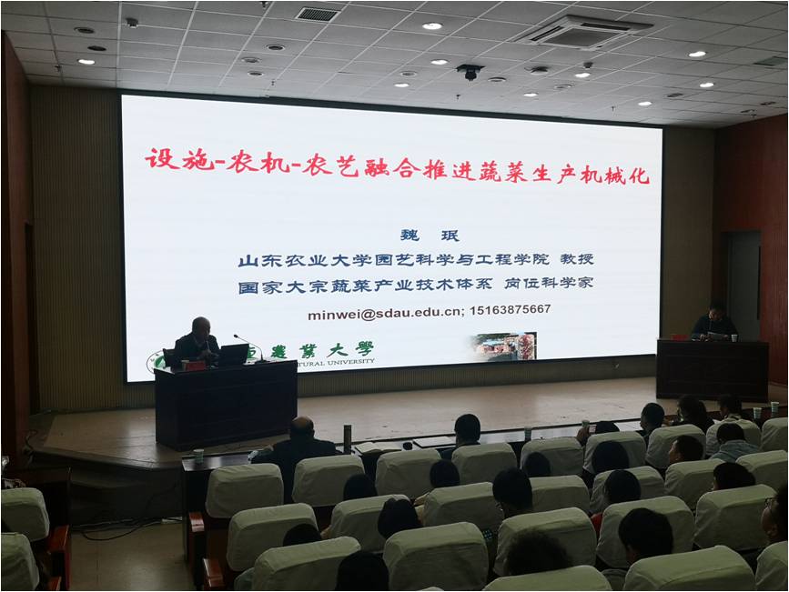 4月1日上午,山东农业大学魏珉教授到我院进行学术交流,在新图书馆一楼学术报告厅做了题目为“设施-农机-农艺融合推进蔬菜生产机械化”的学术报告。学院教师、硕士研究生及本科生参加了报告会。报告会由张毅川副院长主持。