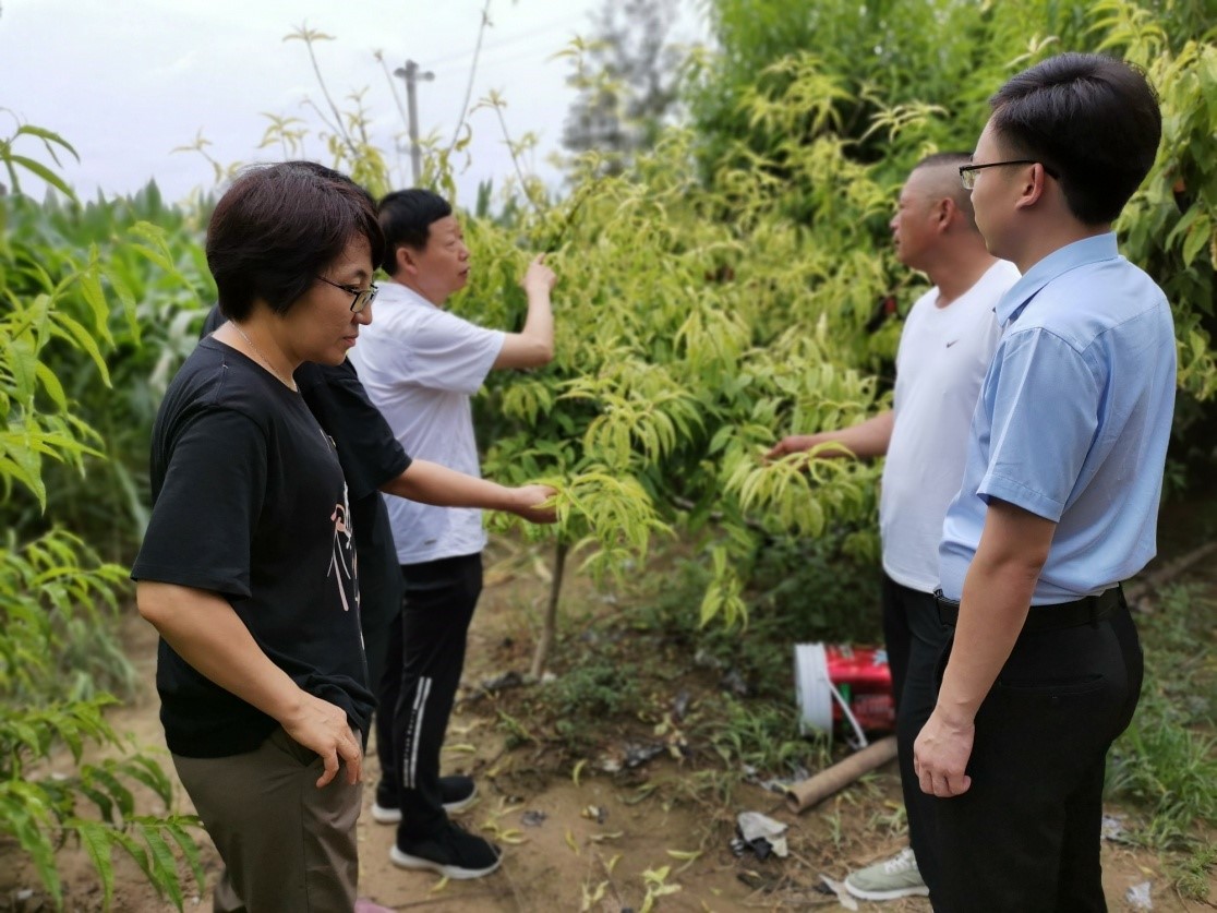 服务团成员首先与乡政府主管工作人员和果农进行了座谈,了解到此次洪涝灾害使僧固乡受灾耕地一万余亩,至今仍有大部分耕地排水困难,很多果园的果树还浸泡在水中。为帮助果农及时排除果园积水,恢复树势,降低损失,服务团向僧固乡捐赠了大功率污水泵和果树急需的杀菌药剂。之后团队成员来到田间地头,仔细查看果园积水情况和树体生长情况,针对地表积水已排净的桃园、樱桃园,提出果园翻耕降墒、适当修剪减少蒸发、及时喷施杀菌剂防病和加强叶面肥增强树势等技术措施。对于还有积水的果园,要求尽快排净积水,之后刨除已淹死果树,以防根系病害发生和传播。最后,服务团一一解答了果农的问题并向果农发放了“洪涝灾害后果园管理技术”明白纸,上面附有服务团成员联系方式等信息,便于后期果农技术咨询。