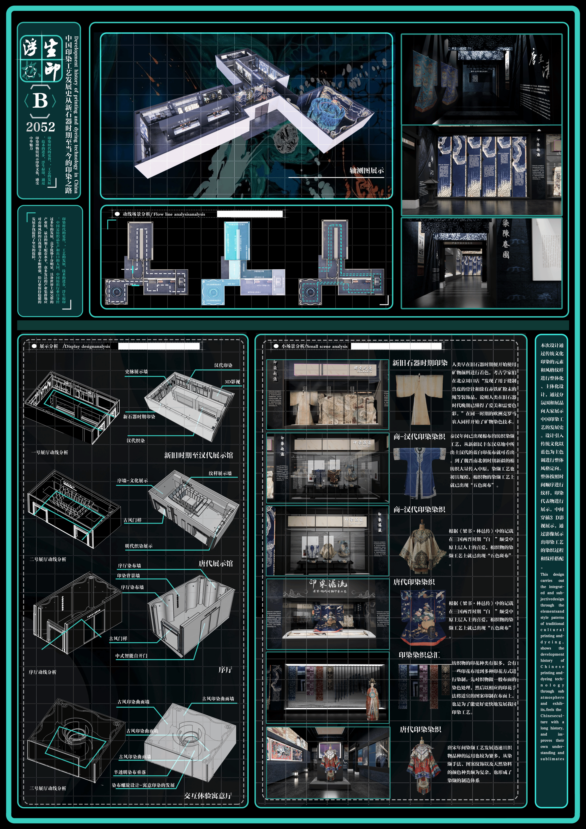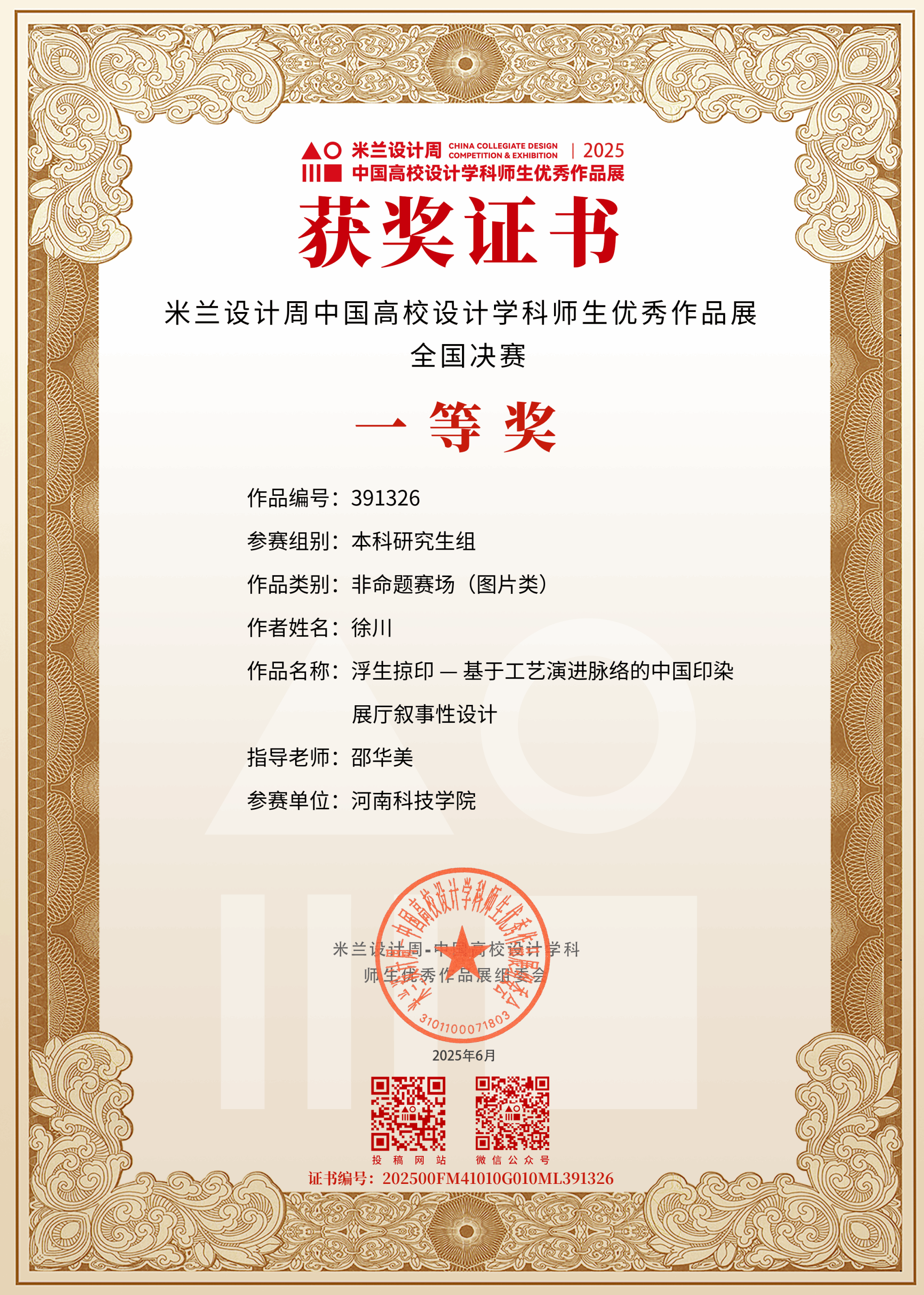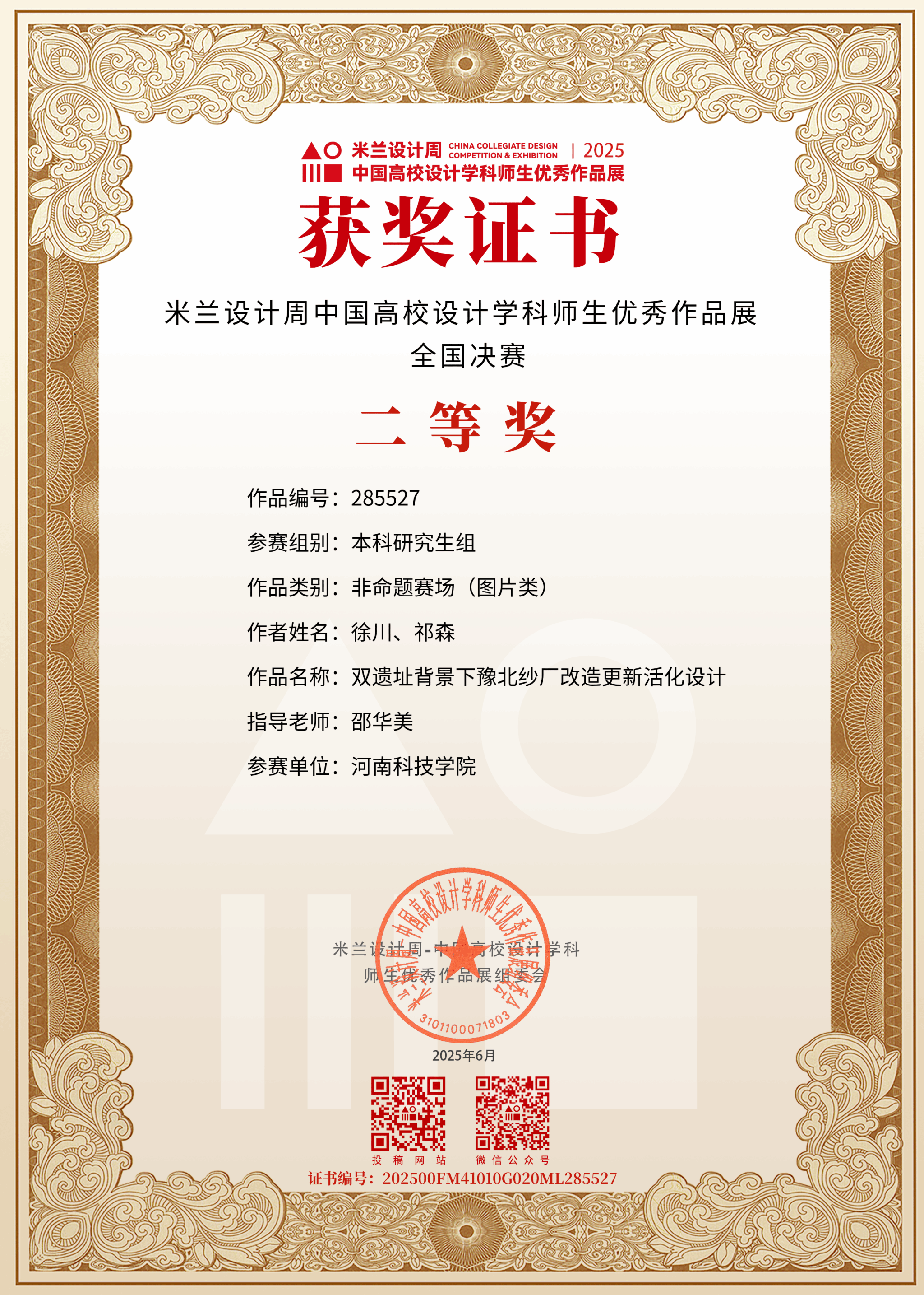 我院邵华美老师指导的风景园林专业2024级硕士研究生徐川同学的参赛作品《浮生掠印——基于工艺演进脉络的中国印染展厅叙事性设计》和《双遗址背景下豫北纱厂改造更新活化设计》在非命题赛场(环境设计赛道和城市设计赛道)中脱颖而出,分别荣获国赛一等奖和二等奖。《浮生掠印——基于工艺演进脉络的中国印染展厅叙事性设计》作品以中华传统印染工艺的演进脉络为叙事主线,融合空间语言与文化表达,展现出深厚的人文理解力与出色的空间整合能力。《双遗址背景下豫北纱厂改造更新活化设计》作品选址殷墟保护区,立足工业遗产保护与更新,通过保留红砖墙体、桁架结构等历史元素,对现存厂房进行功能重塑,实现建筑资源活化利用。