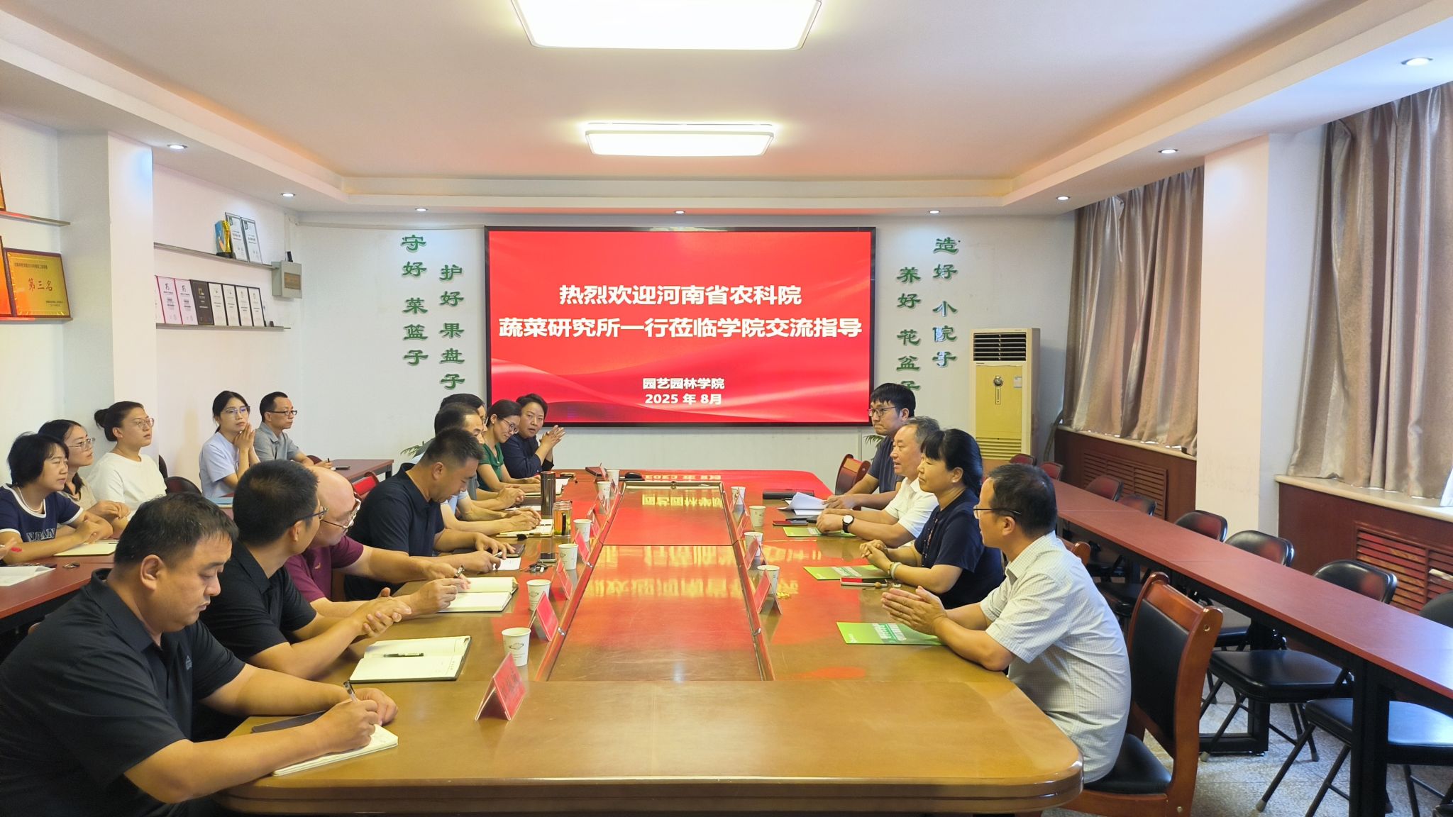 8月27日,河南省农科院蔬菜研究所所长姜鸿勋研究员、副所长姚秋菊研究员一行四人到园艺园林学院开展合作交流。学院党委书记郭超杰、副院长张毅川、南瓜科研团队负责人李新峥教授及团队成员20余人参加了会议。会议由张毅川主持。