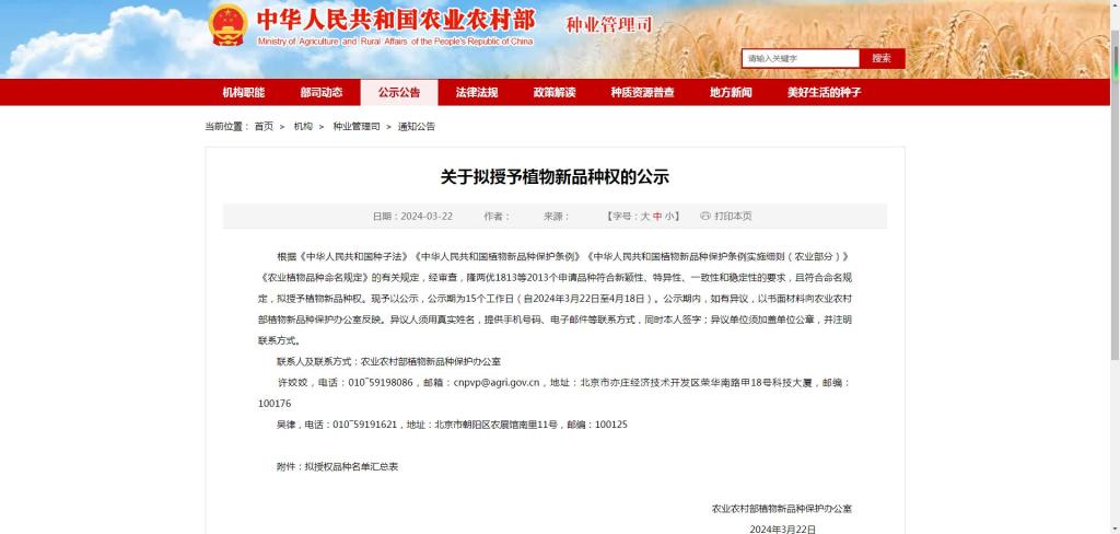 日前,农业农村部植物新品种保护办公室公布了2024年植物新品种权名单,根据《中华人民共和国种子法》《中华人民共和国植物新品种保护条例》等文件,园艺园林学院申请的百蜜1号、百蜜6号、百蜜10号共3个南瓜品种符合有关规定,授予植物新品种权。截止目前,我院已经有5个南瓜品种获得植物新品种权,为百蜜系列南瓜新品种的推广和保护奠定了基础。