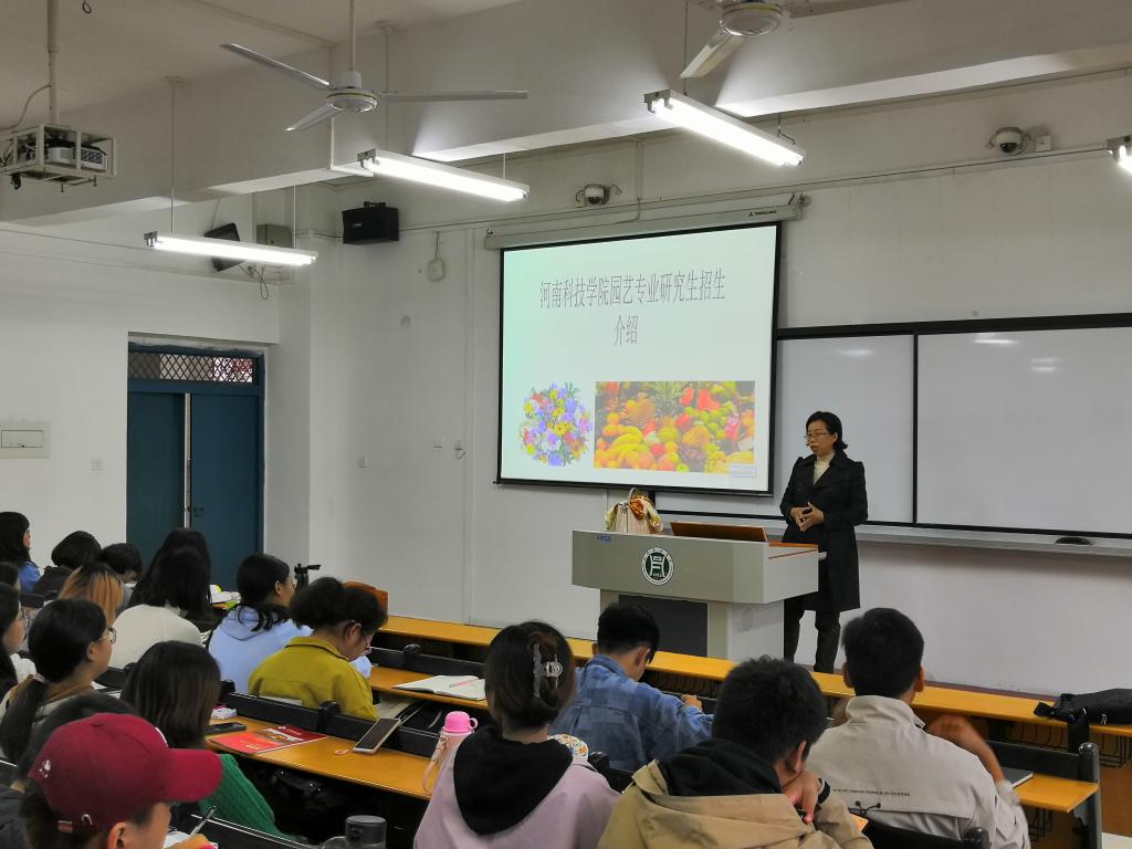 10月8日,园艺园林学院副院长张毅川教授、李贞霞教授、毛达副教授以及姚正阳博士一行四人前往信阳农林学院开展2022年硕士研究生招生宣传工作。在园艺学院,李贞霞就我院园艺学及农艺与种业专业招生相关情况进行了介绍;在规划与设计学院,毛达就我院风景园林学及风景园林专业相关情况进行了介绍。两场宣讲会后,四位老师就同学们提出的相关问题一一做了解答。此外,在宣讲工作结束后,四位老师与园艺学院相关领导和教师就研究生联合培养等方面工作进行了座谈交流,并参观了园艺学院的智慧园艺实训基地。