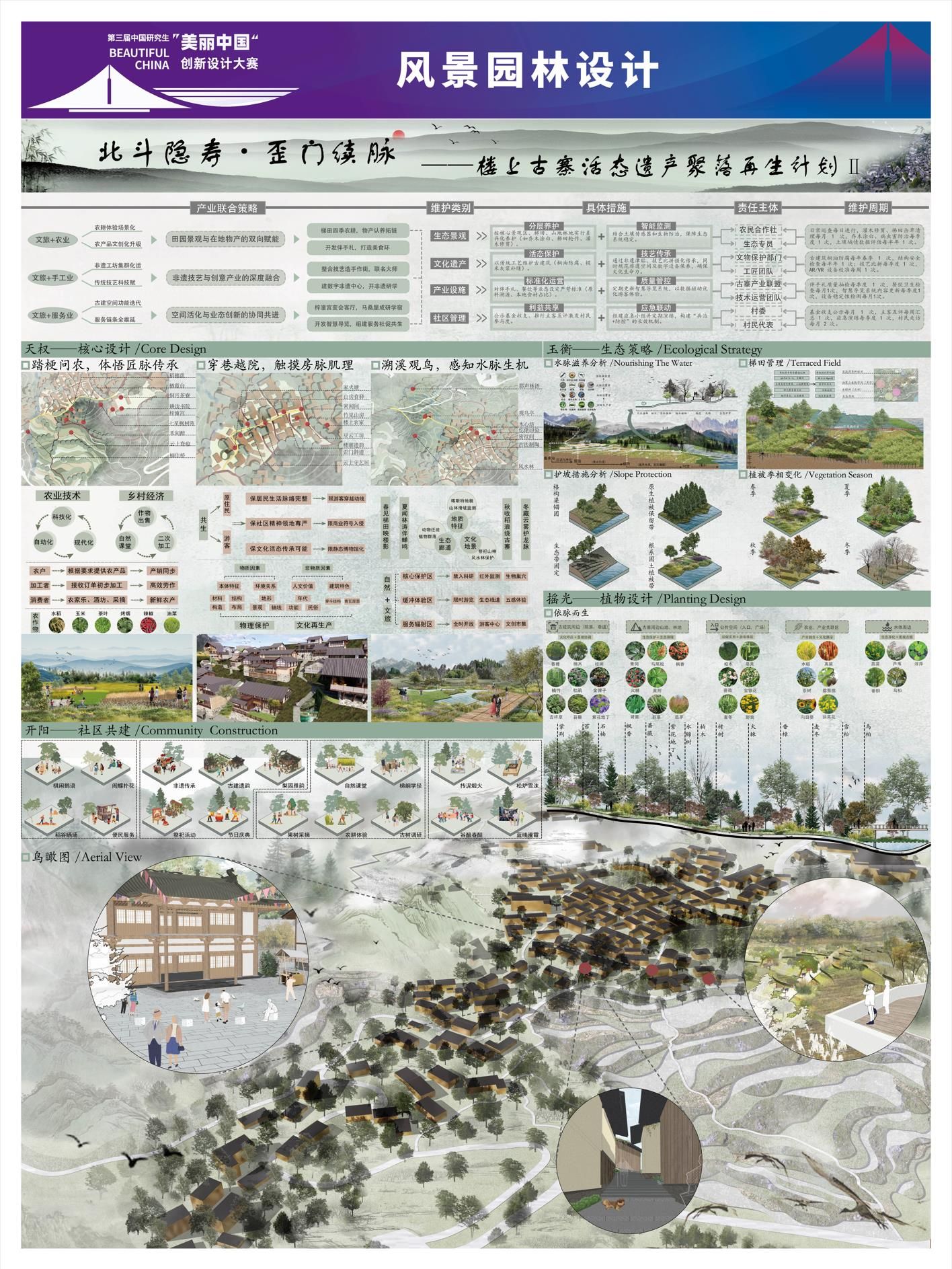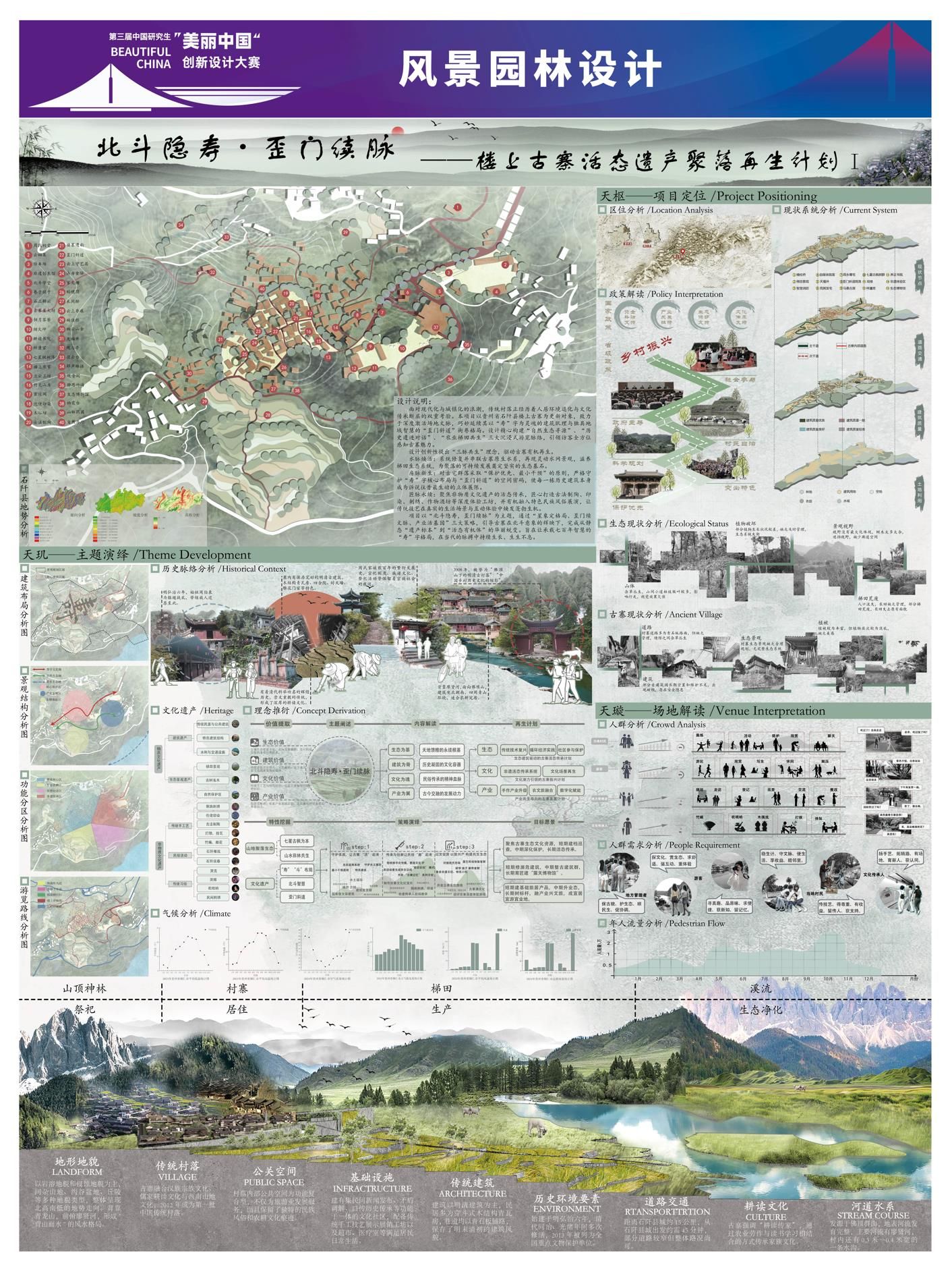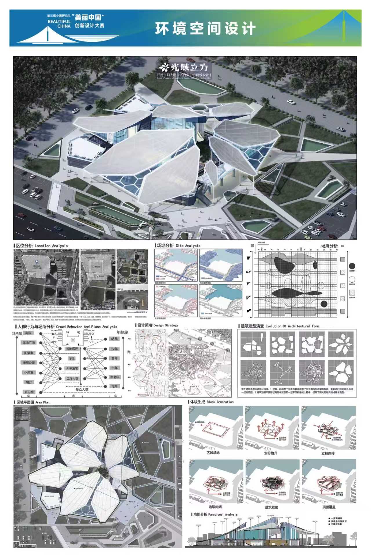 园艺园林学院邵华美老师指导的硕士研究生徐川同学的参赛作品“光域立方”在环境空间设计赛道中脱颖而出,荣获国赛二等奖。园艺园林学院姚正阳老师指导的硕士研究生张庆娇、张晴、李薇、杨浩楠同学的参赛作品“北斗隐寿·歪门续脉——楼上古寨活态遗产聚落再生计划”在风景园林设计赛道中脱颖而出,荣获国赛三等奖。“光域立方”项目选址开封古城阳光湖地块,以服务市民、助力文旅强市为核心目标,在保护原有坑塘遗址与居民区基础上,对部分土地进行规划布局,植入文化、商业及文旅相关业态,为当地经济注入活力。“北斗隐寿·歪门续脉——楼上古寨活态遗产聚落再生计划”作品以“北斗隐寿·歪门续脉”为主题,通过“星象定格局、歪门续文脉、产业活基因”三大策略,引导古寨在北斗意象的辉映下,完成从静态“遗产标本”到“活态有机体”的华丽蜕变,旨在让承载七百年智慧的“寿”字格局,在当代的脉搏中持续生长、生生不息。
