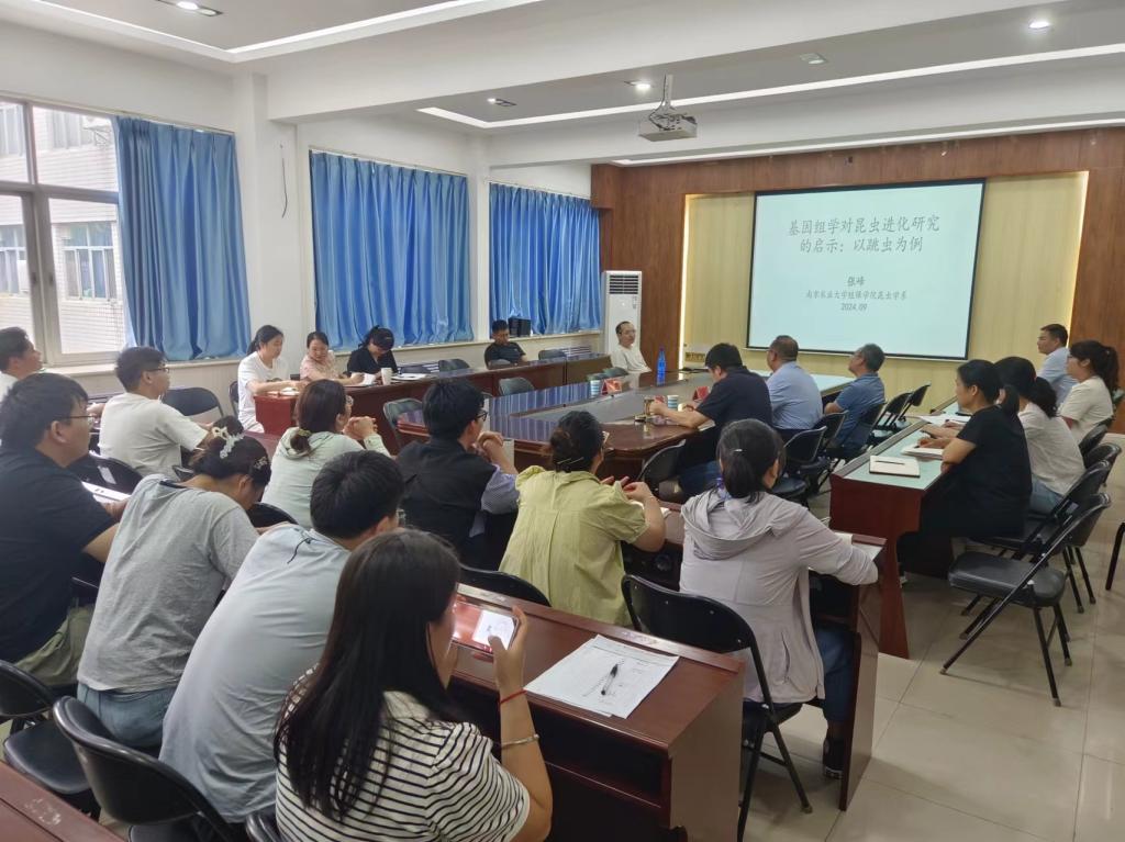 张峰教授以“基因组学对昆虫进化研究的启示:以跳虫为例”为题,介绍了以分类为基础,在系统分类与进化(比较形态、整合分类及系统发育基因组学)、生物多样性(环境DNA、宏条形码、宏线粒体基因组及宏基因组)及基因组学(害虫/模式物种、重要生物学形状及功能验证)领域的研究进展及取得的研究成果。并以跳虫为例,从基因组水平上的系统发育分子标记挖掘、染色体结构进化、多样性基因组学等方面分享了研究成果和应用前景。在交流环节,张峰教授对我院师生们提出的研究问题进行了详细解答。