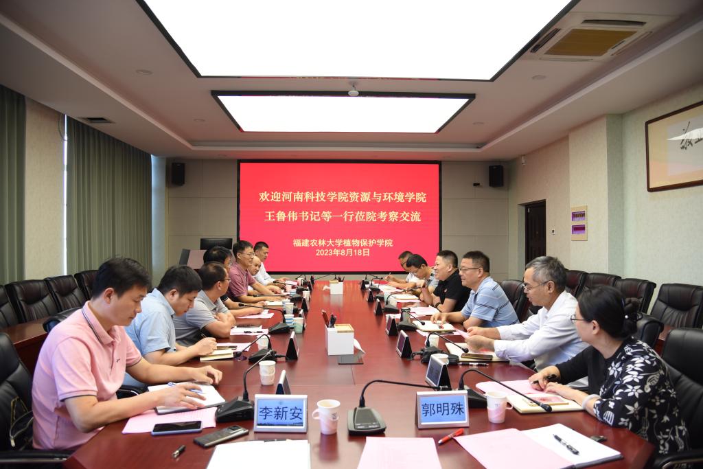 在福建农林大学植物保护学院,院党委书记沈必胜主持座谈会,院长侯有明及班子成员分别介绍了植物保护学科概况、招生就业、科研平台、研究生培养、国际交流合作及社会服务等相关工作。我院党委书记王鲁伟、院长王洪亮分别介绍了学校的历史沿革,学院的专业建设、师资队伍、人才培养及科研工作等情况。双方围绕人才引进、师资队伍建设、专业认证、人才培养质量及教学实践等方面进行了深入交流。会后,与会人员参观了福建农林大学植物保护学院“省部共建闽台作物有害生物生态防控国家重点实验室”等教学科研平台。