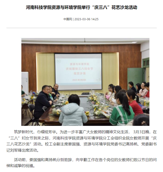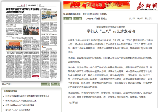 近日,【新乡日报】、【中国网】、【今日头条】等多家媒体平台报道了我院举行庆“三八”花艺沙龙活动。