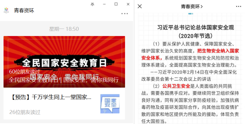 利用新媒体平台开展前期宣传教育。通过微信公众号“青春资环”发布推送国家安全基本知识、习近平总书记关于总体国家安全观的论述、关于生物安全的相关法律法规,及时通知学生收看“千万学生同上一堂国家安全教育课”专家直播。