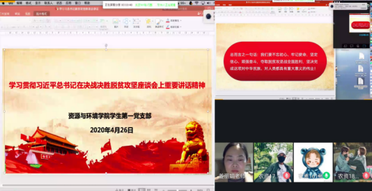 4月23日至27日,资源与环境学院各党支部召开网络视频会议,认真学习贯彻习近平总书记在决战决胜脱贫攻坚座谈会上的重要讲话精神。
