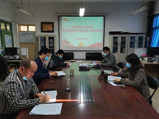 4月24日下午,资源与环境学院在实验楼E301办公室召开会议,学习贯彻习近平总书记在决战决胜脱贫攻坚座谈会上的讲话精神。院党委书记高扬帆、院长王洪亮、党委副书记刘军锋、副院长王国昌,以及学院办公室、团委负责同志参加会议。