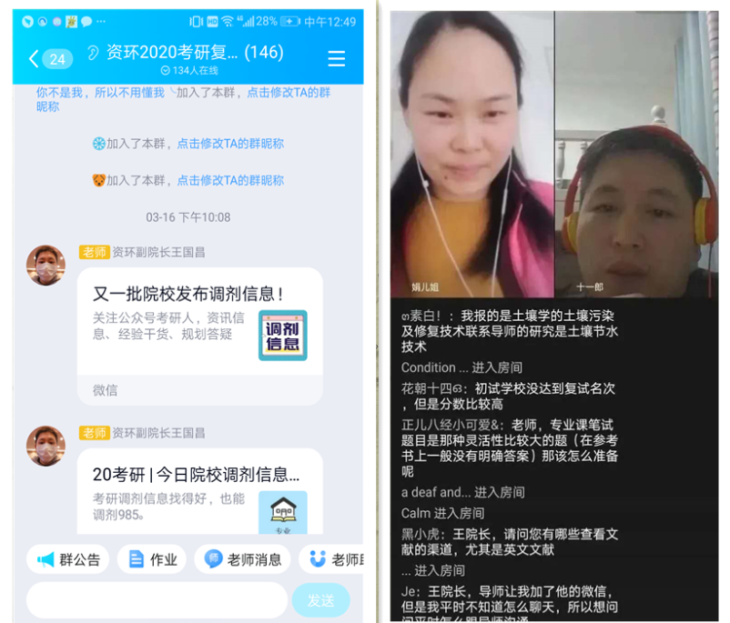 首先,学院在考研成绩公布后第一时间认真摸排学生考研情况,做到心中有数;其次,由学院团委牵头,成立考研复试指导工作群,了解学生关注点,做到有的放矢;再次,根据学生关注点,有针对性的开展复试指导直播讲座。邀请王国昌副院长为2020届考研学生进行线上指导,同时邀请了中国农业科学院植保所在读研究生汪晶晶、陈瑞鹏,为考研学生答疑解惑。直播讲座围绕考研复试各个环节进行讲解互动,在面试、笔试、调剂及联系导师等方面为考研学生提供了系列指导性建议。在国家线公布之后,资环学院将继续围绕考研复试指导、调剂信息发布、导师推荐等方面开展工作,加强师生联动,全员参与,提升考研复试成功率,为资环学子助力加油!