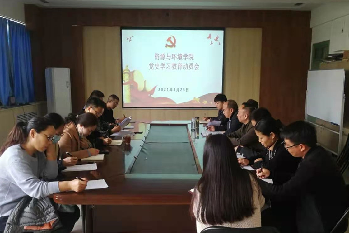 3月25日下午,资源与环境学院在实验楼E307会议室召开党史学习教育动员大会,学院全体处级干部、党支部书记共10余人参加会议。