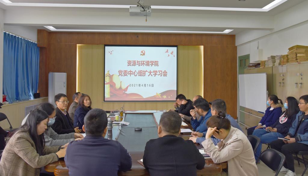 4月16日上午,资源与环境学院在在实验楼E307会议室召开党委中心组扩大学习会议。学院党委中心组成员、全体教师党员参加学习会。会议由院党委书记高扬帆主持。