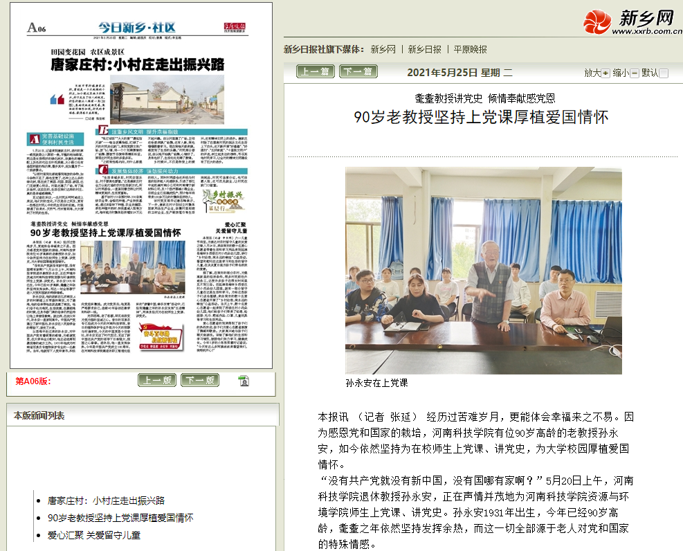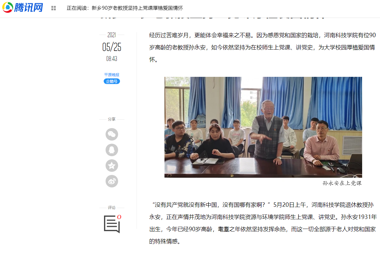 近日,腾讯网、今日头条、新乡电视台、平原晚报等多家媒体平台,报道我校资源与环境学院(原植保系)原主任、退休教师孙永安教授为师生讲党课的事迹。