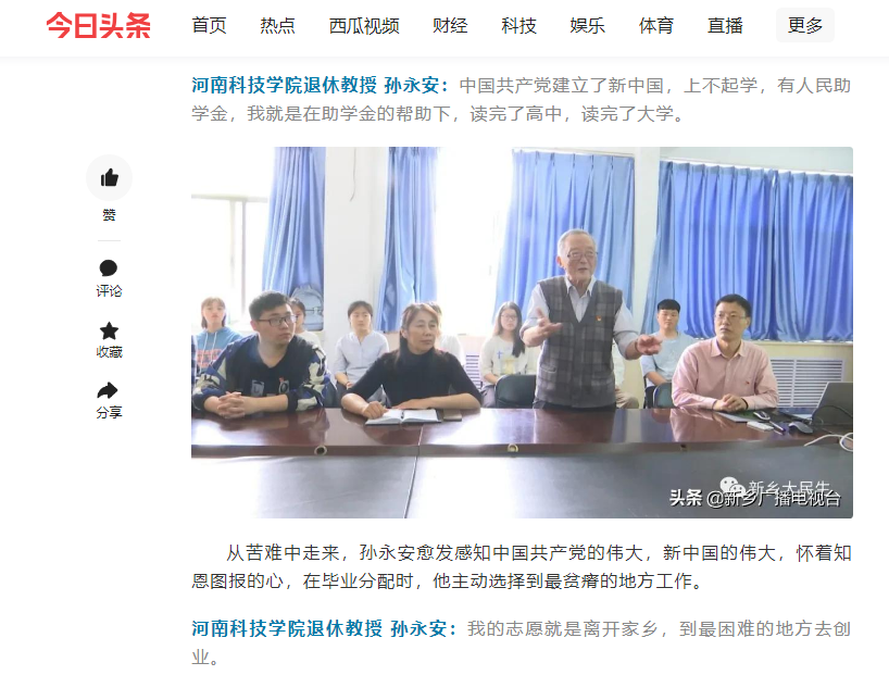 孙永安,1931年生,经历过南京大屠杀,靠国家发放的助学金资助才上完大学。大学毕业后,孙永安教授感恩于党和人民,自愿到当时相对艰苦的百泉农专(现更名为河南科技学院)任教。