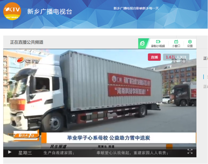 7月28日,新乡电视台大民生频道以《毕业学子心系母校 公益助力雪中送炭》为题,报道了我校资源与环境学院2013届毕业生秦晨亮心系母校灾情,积极组织协调社会爱心人士,顶着炎炎烈日,带着睢县白楼乡人民的爱心,为母校师生送来新鲜蔬菜和灾后防疫消杀物资的事迹。