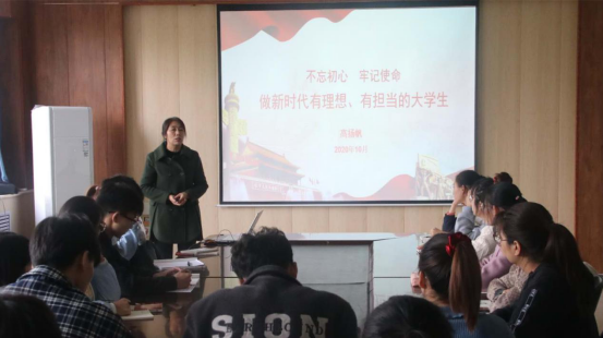 开班典礼结束后,院党委书记高扬帆为入党积极分子做党课第一讲。她以"不忘初心,牢记使命做时代有理想,有担当的大学生"为题,介绍了开展“不忘初心、牢记使命”主题教育的重要意义和要求。她结合我国发展历程详细讲解了中国共产党人的初心和使命是什么,为什么要强调不忘初心、牢记使命,党的初心和使命的实现情况等。最后,高扬帆要求在座的同学们,要树立远大理想、奋发展现新作为,做德智体美劳全面发展的社会主义建设者和接班人。