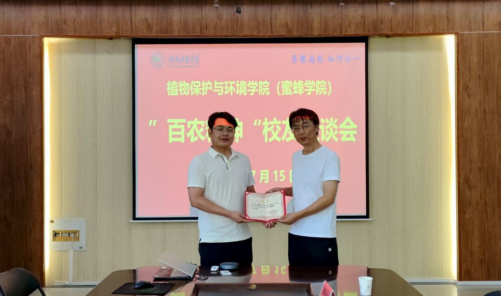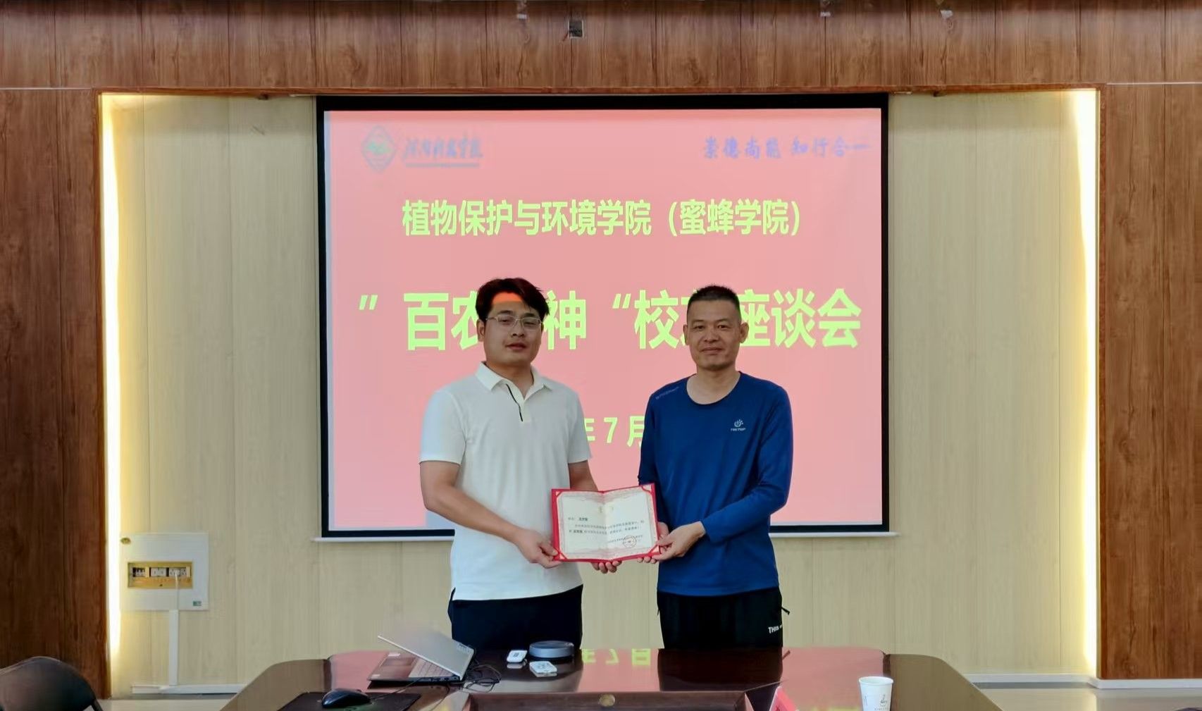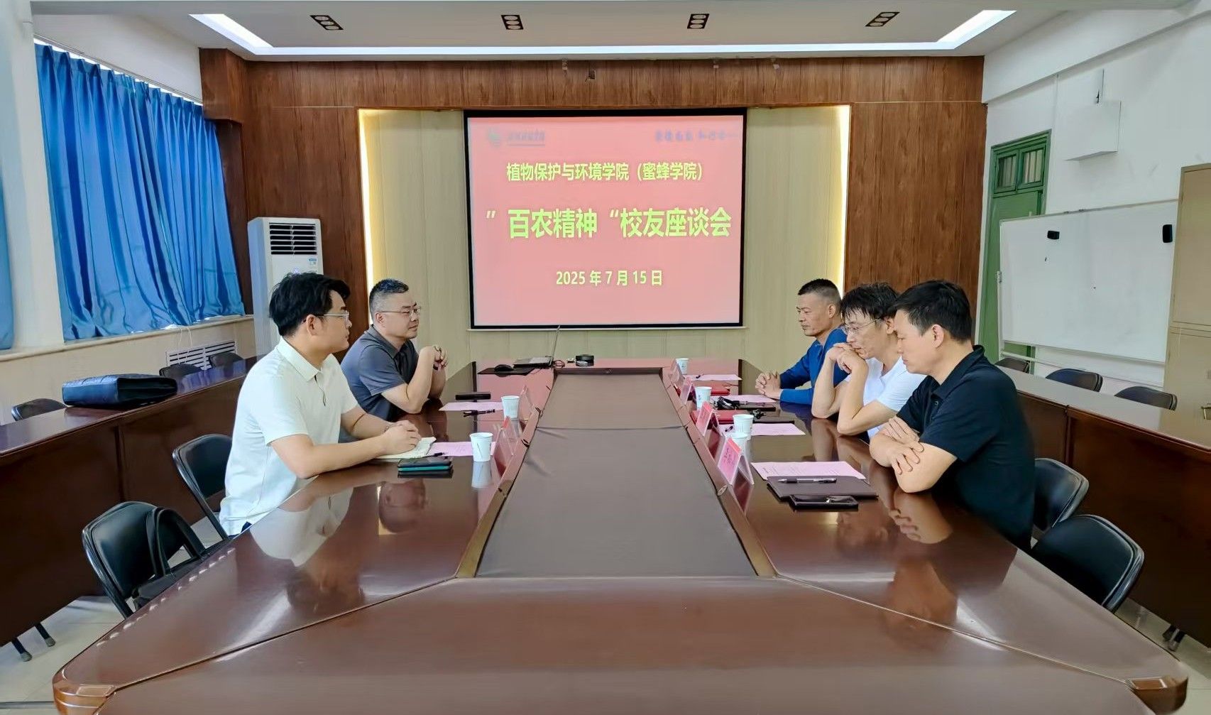 7月15日,植物保护与环境学院(蜜蜂学院)在实验楼E307会议室举办“百农精神”校友座谈会,巴斯夫(中国)有限公司河南分公司总经理李加乐(植保2006届)、长沙中微科生物工程有限公司总经理王世豪(农资2017届)重返母校,与学院领导班子及教师代表深入交流。学院党委书记王鲁伟、副院长孔凡彬、李松伟等出席活动,