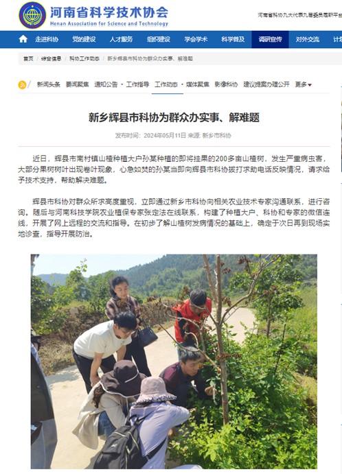 近日,河南省科学技术协会网站宣传报道我院农业植保专家张定法、吴利民老师深入辉县市南村镇孙某果树基地,现场帮扶解决山楂树病虫害问题。通过本次活动,张定法、吴利民老师不仅为农户解决食心虫、蚜虫等虫害提供了宝贵的防控经验,同时也充分彰显资源与环境学院在推进新质生产力发展,助推乡村振兴方面的责任与担当。