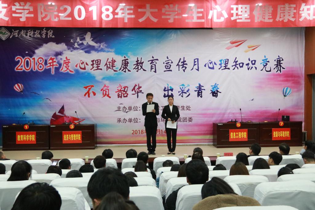 11月14日晚上,由党委学工部学生处主办,资源与环境学院承办的“不负韶华,出彩青春”2018年度心理知识竞赛决赛在图书馆一楼报告厅举行。党委学工部学生处、教育科学学院、信息工程学院、经济与管理学院、资源与环境学院相关单位负责人、心理辅导员及学生代表200余人观看了比赛。