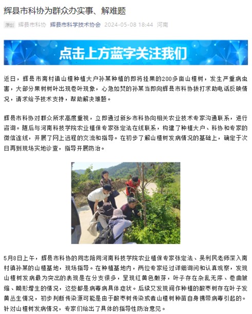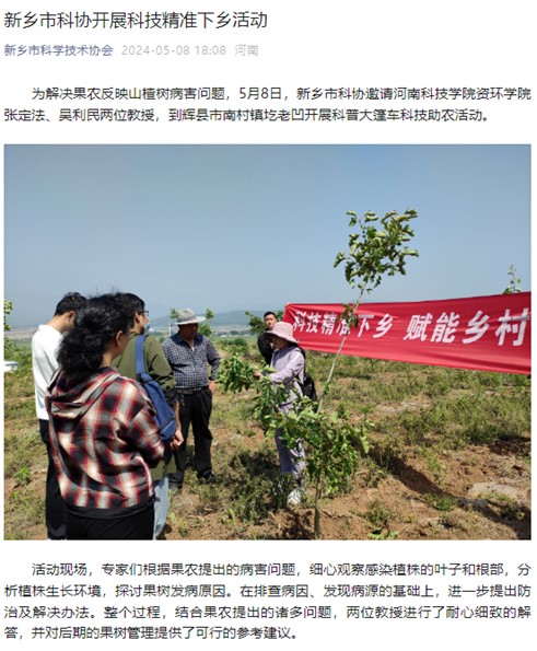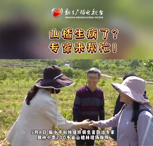 5月8日,为解决果农反映山楂树病害问题,应辉县山区山楂种植大户孙某的邀请,资源与环境学院果树病虫害专家张定法、吴利民老师赴辉县市南村镇进行现场帮扶和技术指导,辉县市科学技术协会、新乡市科学技术协会和新乡广播电视台等多个媒体和公众平台对该活动进行现场报道。