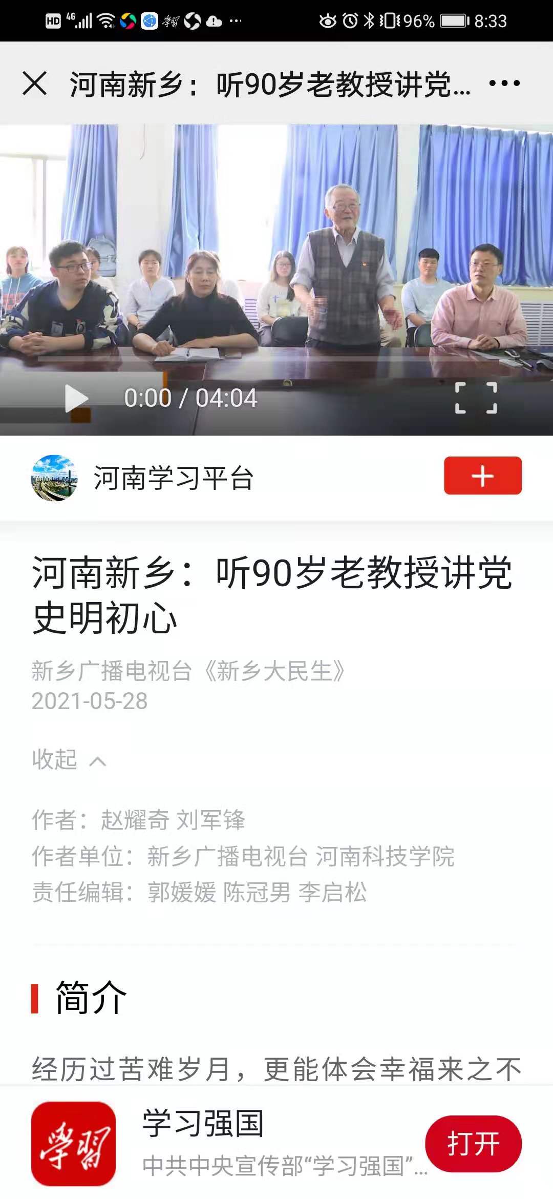 5月28日,【学习强国】平台以“听90岁老教授讲党史明初心”为题,展播资源与环境学院学党史、讲党课视频,视频时长四分零四秒。