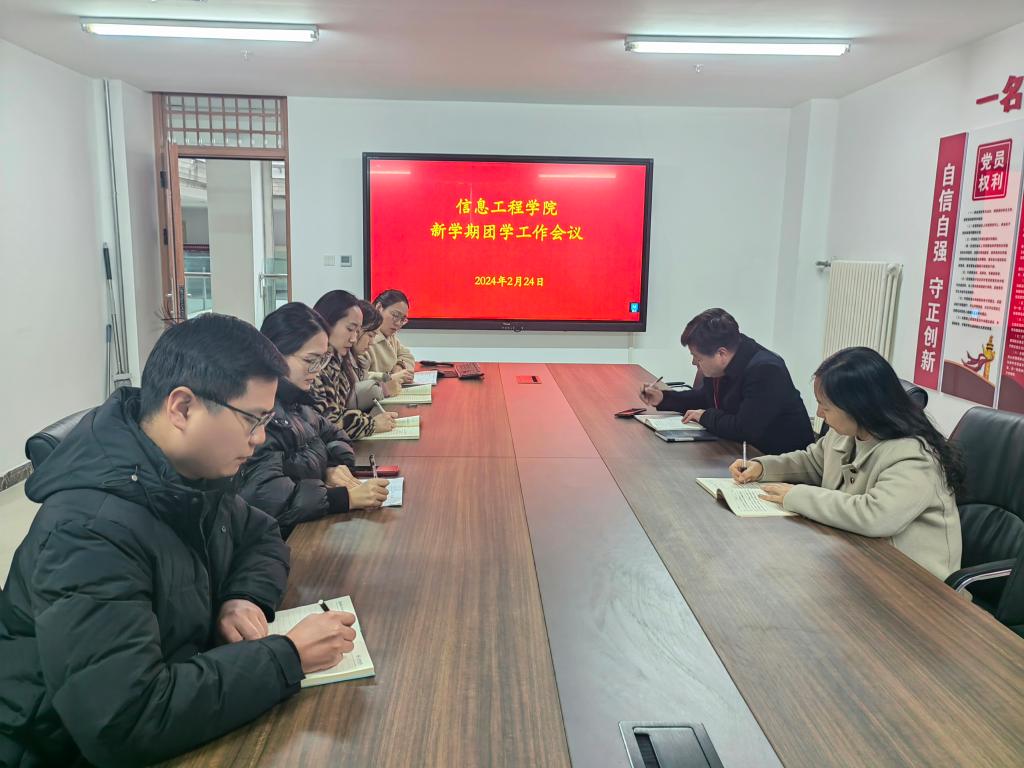 为确保新学期各项工作安全、有序、高效开展,2月24日下午,信息工程学院在弘文楼413会议室召开新学期团学工作会议。学院党委书记李印、党委副书记王明艳、团委书记袁家祺,全体辅导员参加会议。会议由王明艳主持。