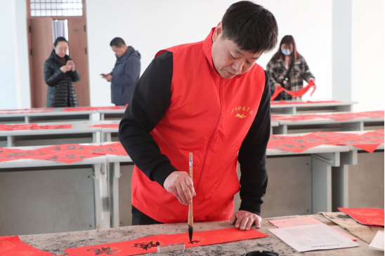 铺毡、放纸、蘸墨、起笔……我校书画协会的志愿者们挥毫泼墨、笔走蛇龙,一张张情意满满的“福”字,一副副充满节日气息的春联跃然纸上。行云流水的字体与对句精巧的春联让现场的教职工们赞不绝口。“春来人如画,福至梦开花”“铺开盛世和谐卷,写就中国美丽篇”……浓墨红纸间,用心凝聚的每一笔都是对我校师生的美好祝愿。志愿者们将写好的春联细心卷好,带着自己的祝福一同送予在场教职工,活动现场“年味”十足。