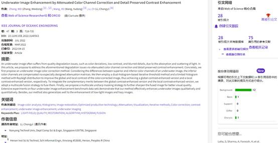 近日,根据科睿唯安ESI(Essential Science Indicators)公布的最新数据,以信息工程学张卫东博士为第一作者、发表在中科院二区期刊IEEE Journal of Oceanic Engineering上的论文Under water Image Enhancement by Attenuated Color Channel Correction and Detail Preserved Contrast Enhancement入选ESI高被引论文。自2022年7月入职我校以来,张卫东博士已有5篇论文入选ESI高被引论文,其中2篇我校为第一单位。