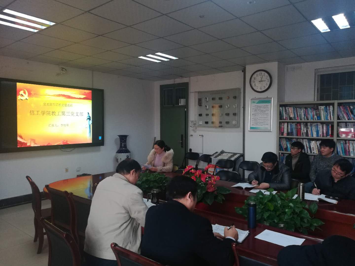 根据校党委组织部要求,12月25日,信息工程学院党委在0号楼502会议室召开党支部书记抓党建工作述职评议会议,学院党委书记郎瑞红主持会议并讲话,全体党委委员参加会议并对党支部书记工作进行评议,部分支委和党员群众代表参加评议会。