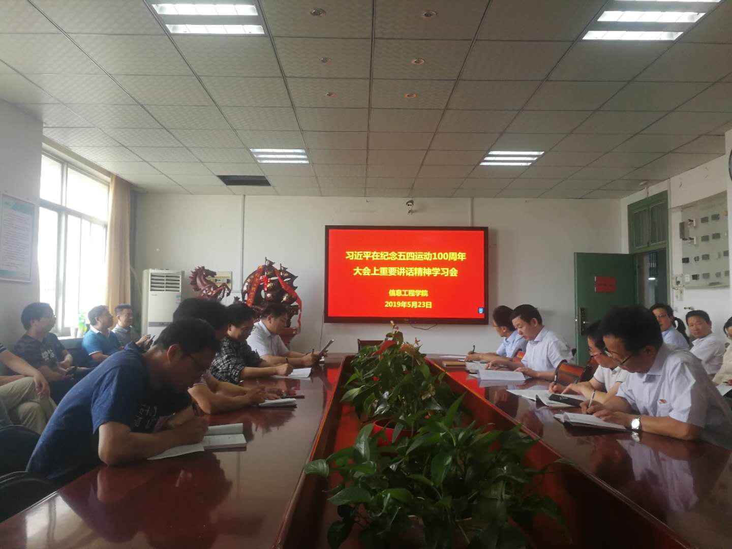 按照学校党委宣传部关于转发《中共教育部党组关于教育系统认真学习贯彻习近平总书记在纪念五四运动100周年大会上重要讲话精神的通知》的通知要求,信息工程学院于5月23日,在0#502会议室召开了学习贯彻习近平总书记在纪念五四运动100周年大会上重要讲话精神会议,学院党政领导及全体教职工参加会议。会议由信息工程学院党委副书记张建设主持。
