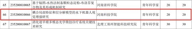 9月23日,河南省科学技术厅和河南省科学院发布了关于2023年度第二批省级科技研发计划联合基金项目立项的通知。我院张卫东博士主持申报的项目“耦合局部特征和层分解模型的水下机器人视觉增强研究”成功获批青年科学家项目。