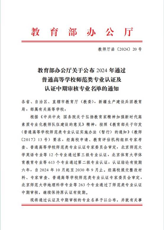 近日,教育部办公厅发布《关于公布2024年通过普通高等学校师范类专业认证专业名单及中期审核专业名单的通知》(教师厅函〔2024〕20号),信息工程学院教育技术专业顺利通过师范类专业第二级认证,认证有效期为2024年10月至2030年9月。