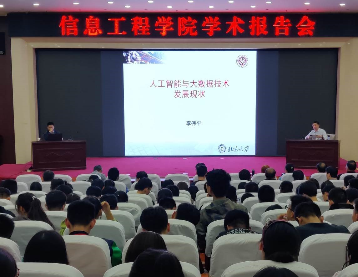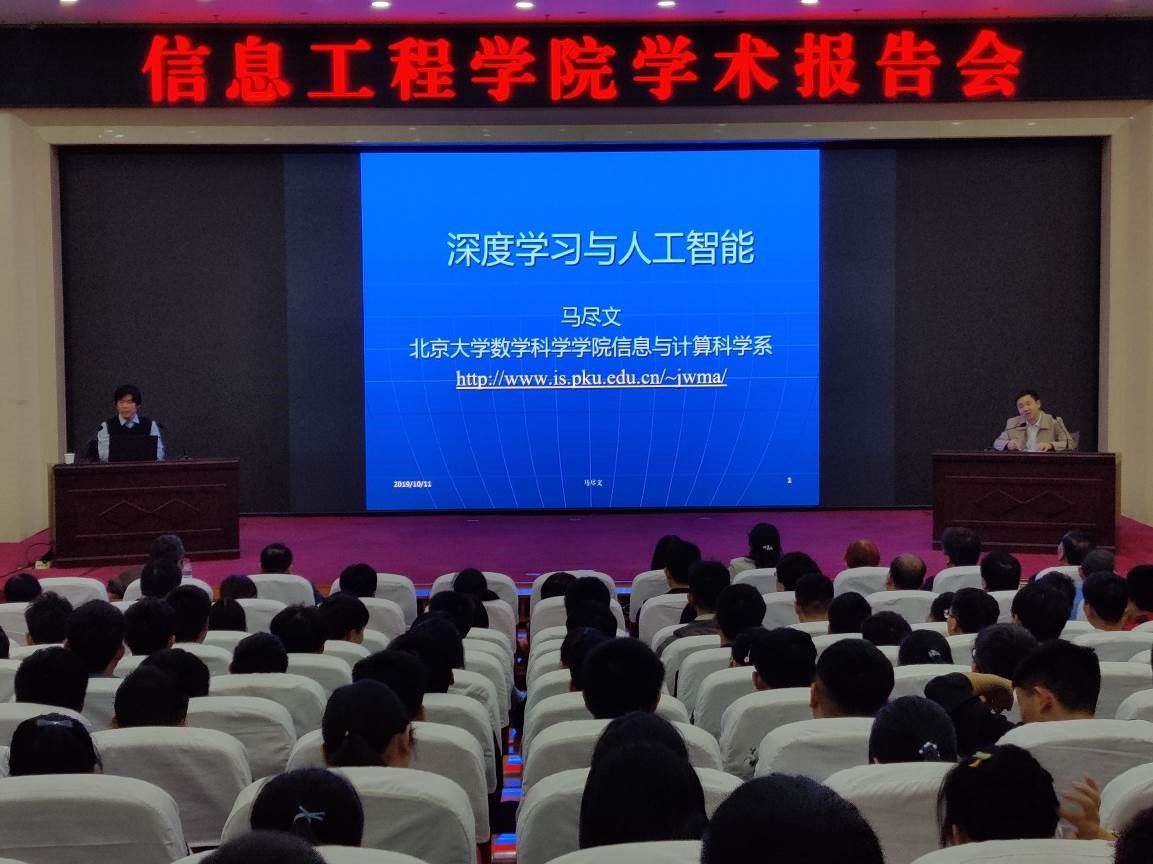 10月11日下午,应信息工程学院邀请,北京大学数学科学学院马尽文教授和软件与微电子学院李伟平教授在我校行政楼308报告厅,做了以“深度学习与人工智能”、“人工智能与大数据技术发展现状”为主题的学术报告。会议由信息工程学院院长李国厚主持,学院部分领导、教师及学生300余人参加此次会议。