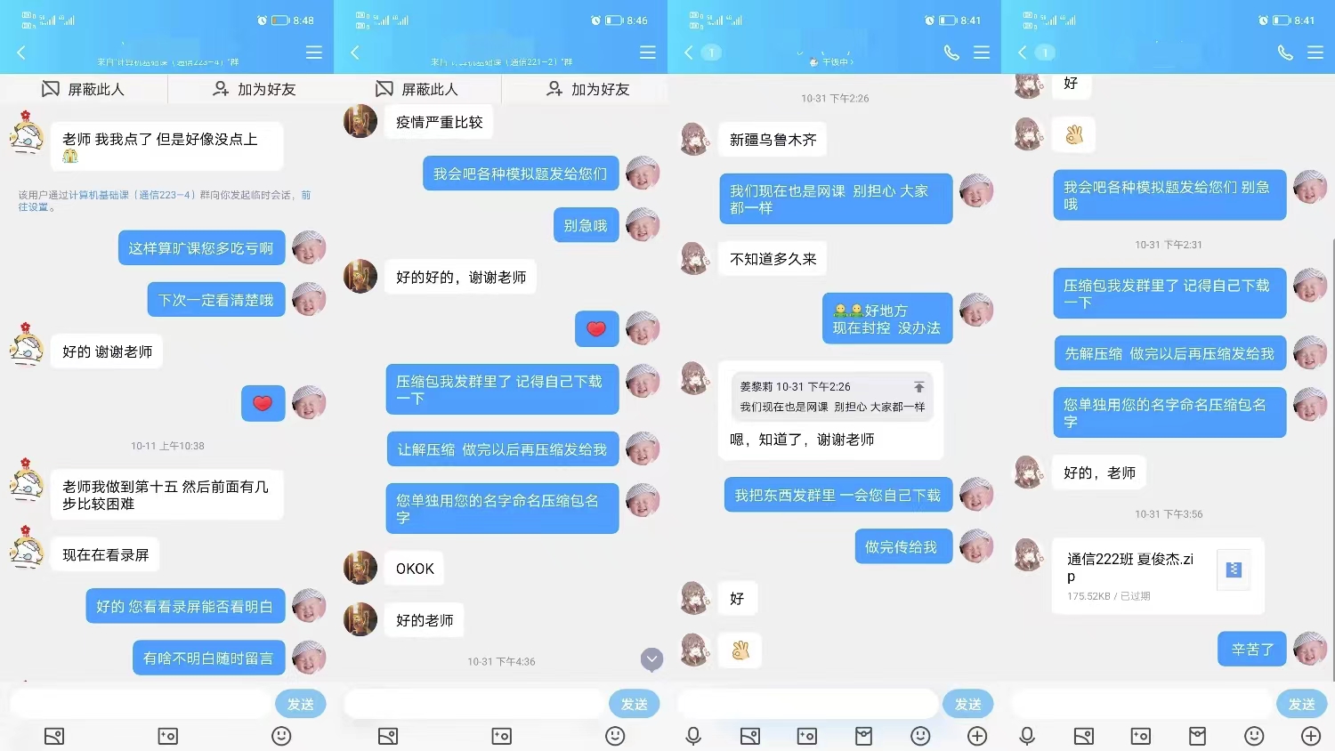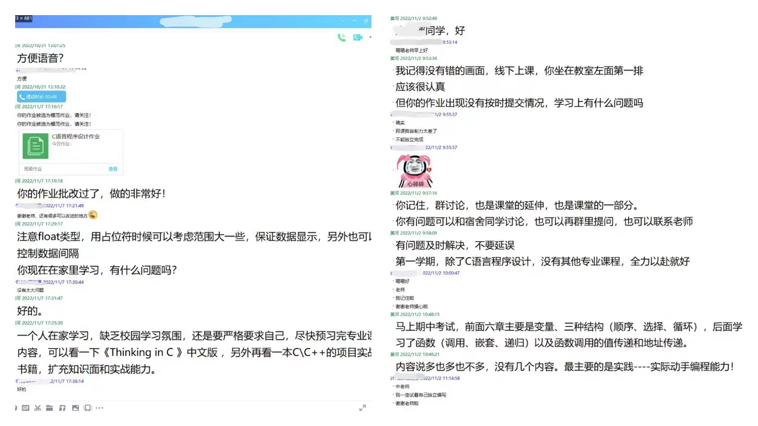 悉心指导学业,让学生安心。学院高度重视因疫情未返校同学的学习情况,除日常网课学习外,各专业课教师主动与他们开展一对一的课后辅导,架起了学习辅导的“云桥梁”。黄勇老师在与学生沟通过程中,提醒计科专业学生在预习专业基础课的基础上,要主动学习《Thinking in C》等项目实战书籍,扩充知识面,提高实战力。姜黎莉老师对未返校学生的每一份作业都用心批改、及时反馈、耐心答疑。其他任课老师也都和未返校的同学们进行联系交流、课后辅导,指导大家的专业学习。