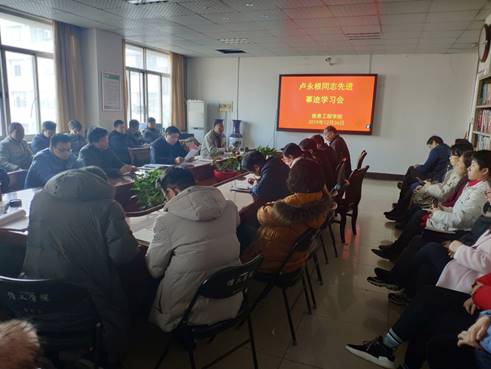 学院党委副书记张建设传达《教育部关于在教育系统深入开展向卢永根同志学习的通知》和我校《关于向卢永根同志学习的通知》要求,全文传达学习了卢永根同志的先进事迹,全体教师通过学习卢永根同志的先进事迹,感受到了其对党忠诚、至诚报国的爱国情怀以及教书育人、刻苦钻研的敬业精神;学习到了卢永根同志勇担重任,用自己的知识和本领服务人民的精神。广大教师纷纷表示在今后的工作中要以卢永根为榜样,努力为学校的发展贡献自己力量。