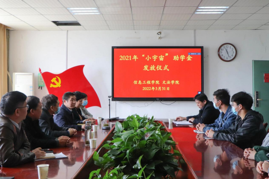3月31日,信息工程学院、文法学院“小宇宙”助学金发放仪式在0#502会议室举行,校友张献超、张会娟通过线上视频参加仪式。校长办公室副主任、校友会办公室主任刘弘,文法学院院长周全星、党委副书记邵帅、副院长王振军、张东旭,食品学院党委副书记刘克平,信息工程学院党委书记郎瑞红、院长李国厚,部分辅导员以及受资助的15名学生参加仪式。信息工程学院党委副书记张建设主持仪式。